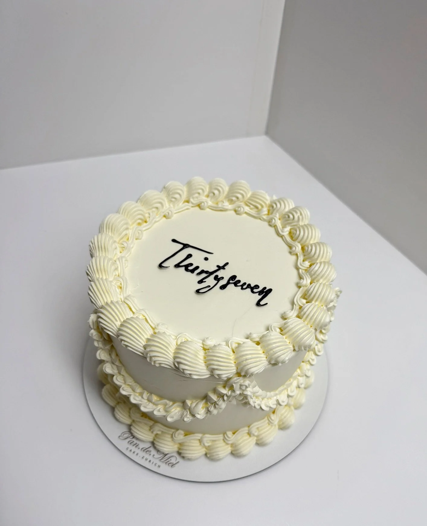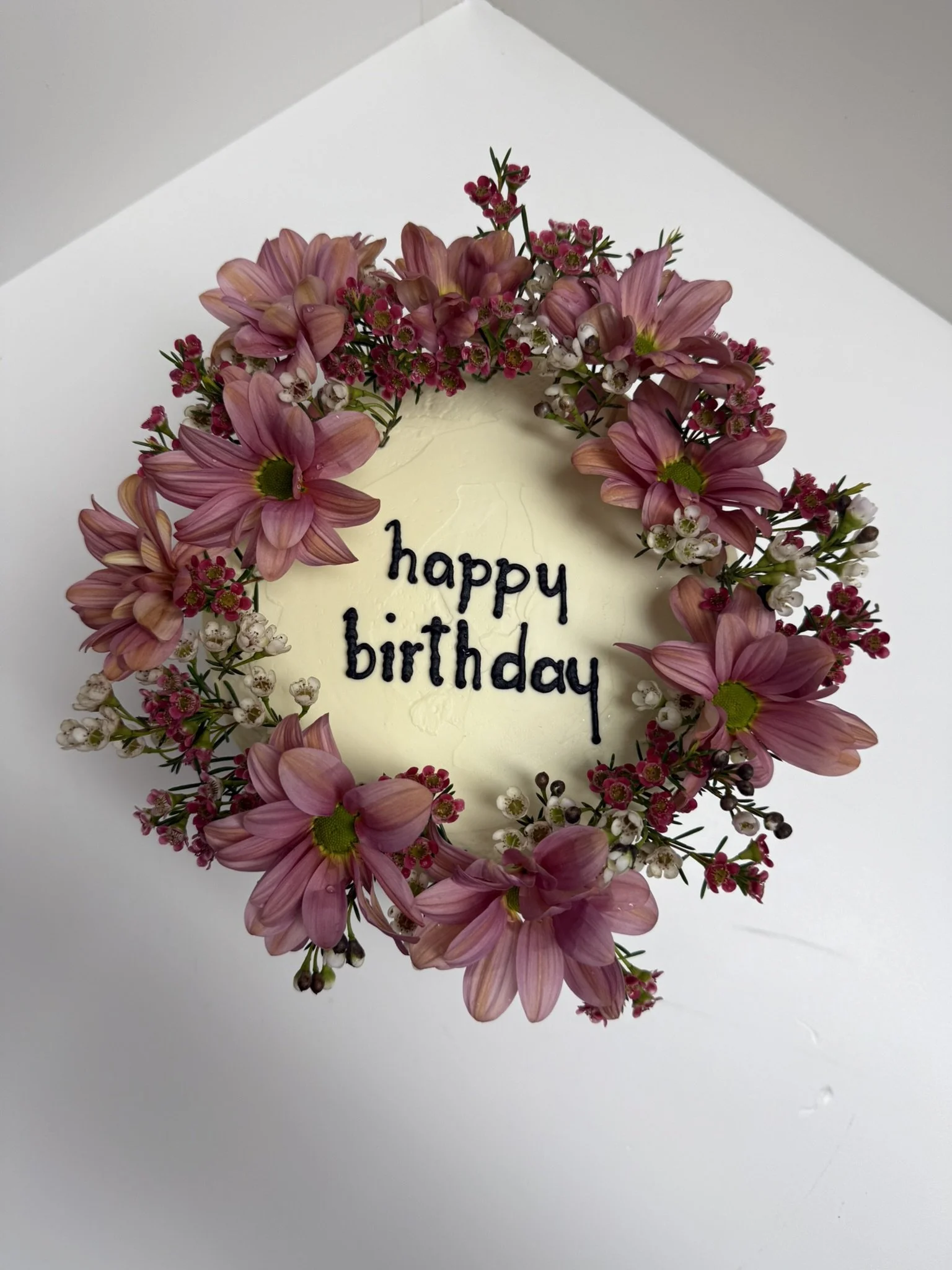 Elegante Torte dekoriert mit saisonalen Blüten und “Happy Birthday” Schriftzug.
